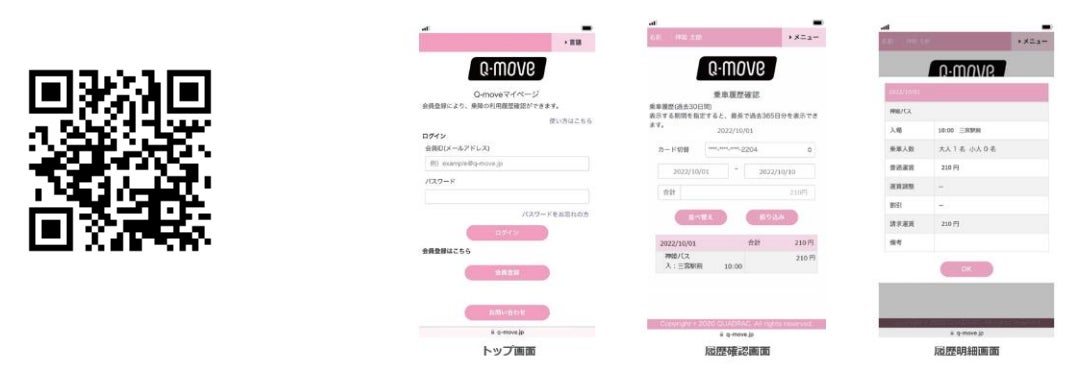 なお、お客様ご自身でご利用履歴や、上限運賃の適用をご確認いただくには、交通事業者向け決済及び認証のプラットフォームを提供するQUADRAC社の「Q-move」サイトにアクセスすると閲覧が可能になります。(「マイページ」の会員登録手続きが必要になります。)