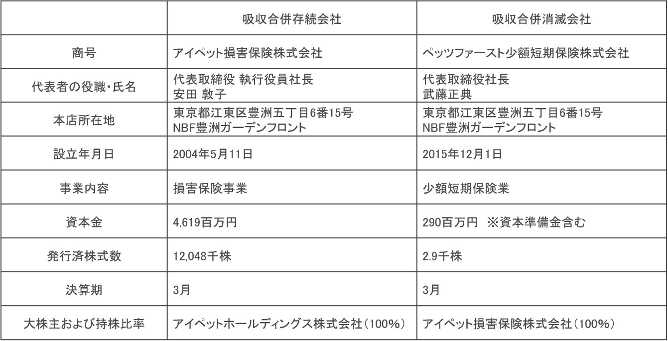 アイペット損害保険株式会社(本社:東京都江東区、代表取締役 執行役員社長:安田敦子 以下、当社)は、本日開催の取締役会において、関係当局の認可等を受けることを前提として 当社の子会社であるペッツファースト少額短期保険株式会社(本社:東京都江東区、代表取締役社長:武藤正典 以下、ペッツファースト少短)を吸収合併することを決議し、合併契約を締結いたしましたので、お知らせいたします。