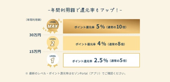 「SAISON GOLD Premium」 は、お客様の日々の生活に寄り添った「感動体験の創出」と「快適なキャッシュレス生活の提供」を目指し、“使えば使うほど特典が増えていく” カード利用プログラムを備えております。お客様には年間のショッピング利用金額に応じたポイント還元やオリジナル優待サービスなどのプレミアム特典を提供いたします。