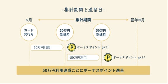 一年間の集計期間中に、カードご利用金額が50万円に到達するごとにボーナスポイントをプレゼント!カードを利用すればどこでも貯まる、嬉しいボーナスです。