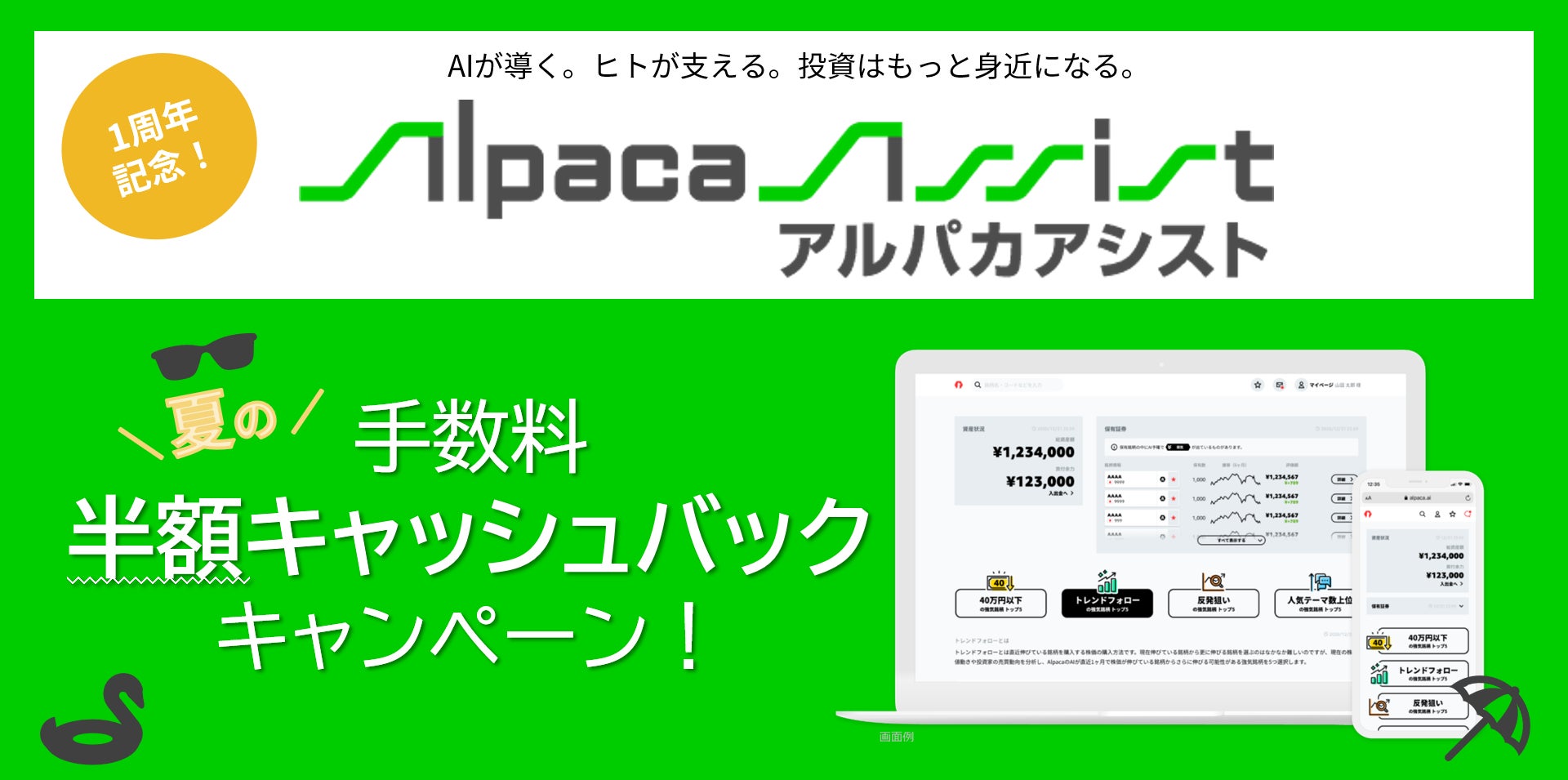 【 AI×ヒトの新しい投資サービス「アルパカアシスト」 】一周年記念・ 夏の手数料半額キャッシュバックキャンペーン!