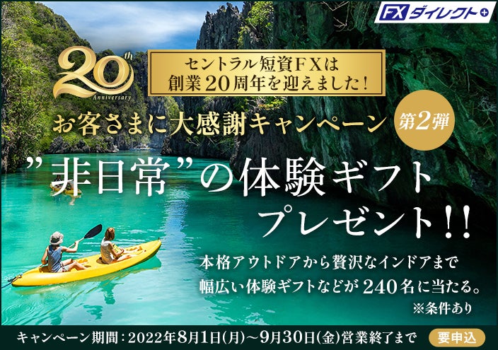 キャンペーンに申し込み、キャンペーン期間中に「FXダイレクトプラス」で合計400万通貨以上の新規約定取引をされたお客さまの中から抽選で、本格アウトドアから贅沢なインドアまで幅広いジャンルの”非日常”体験ギフトや、受け取った人が好きなギフトを選べるデジタルギフト®が240名様に当たる大感謝キャンペーン第2弾を実施します。