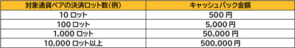 決済10万通貨(1ロット)ごとに50円、最大50万円をキャッシュバックいたします。