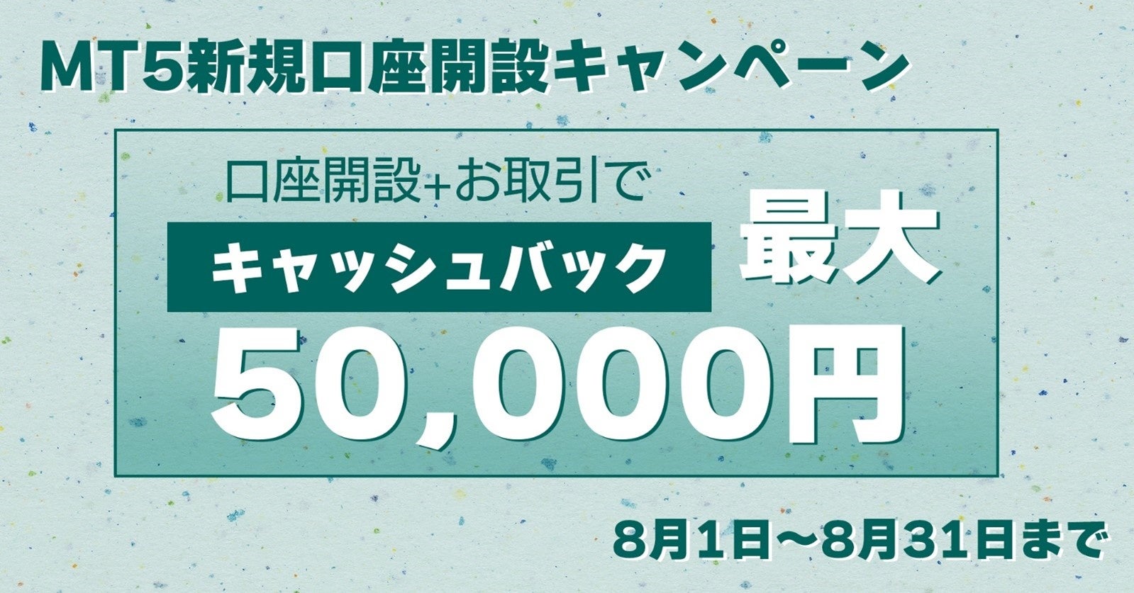 期間中にMT5口座を開設されたお客様のうち、条件を達成されたお客様を対象に最大5万円のキャッシュバックをいたします。