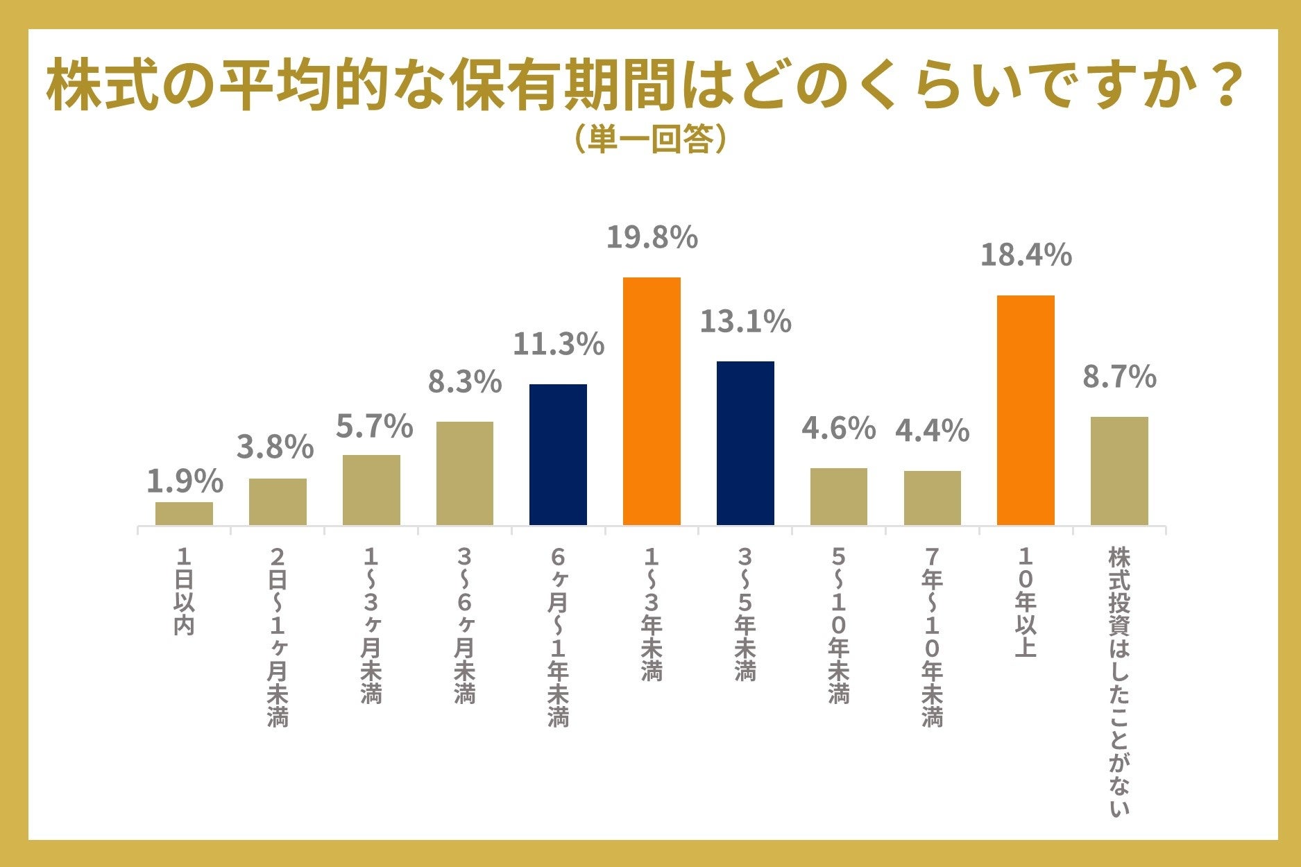 株式の平均保有期間では、19.8%の人が「1年~3年未満」と回答し、18.4%の人が「10年以上」と回答しました。