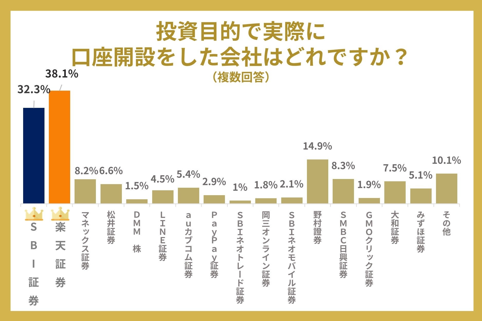 Q1.に続き、実際に口座開設をされた数でも一番目は楽天証券(38.1%)で、二番目がSBI証券(32.3%)という結果になりました。