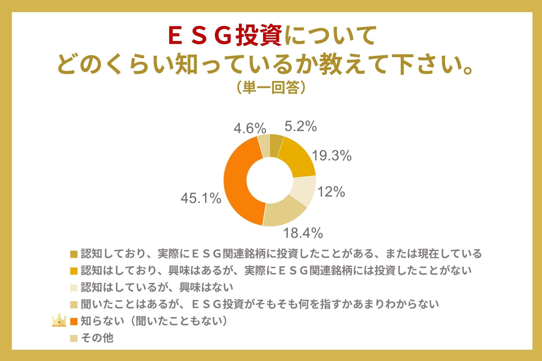 ESG投資についてでは、45.1%の人が「知らない(聞いたこともない)」と回答しており、「認知しており、実際にESG関連銘柄に投資したことがある、または現在している」と回答した人は5.2%でした。