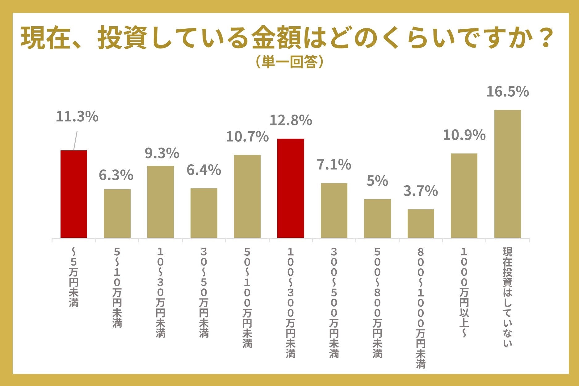 現在の投資金額では、100万円以上~300万円未満と回答した人が12.8%で一番多く、二番目に多かったのが5万円未満で11.3%でした。また、16.5%の人は、現在投資はしていないということがわかります。