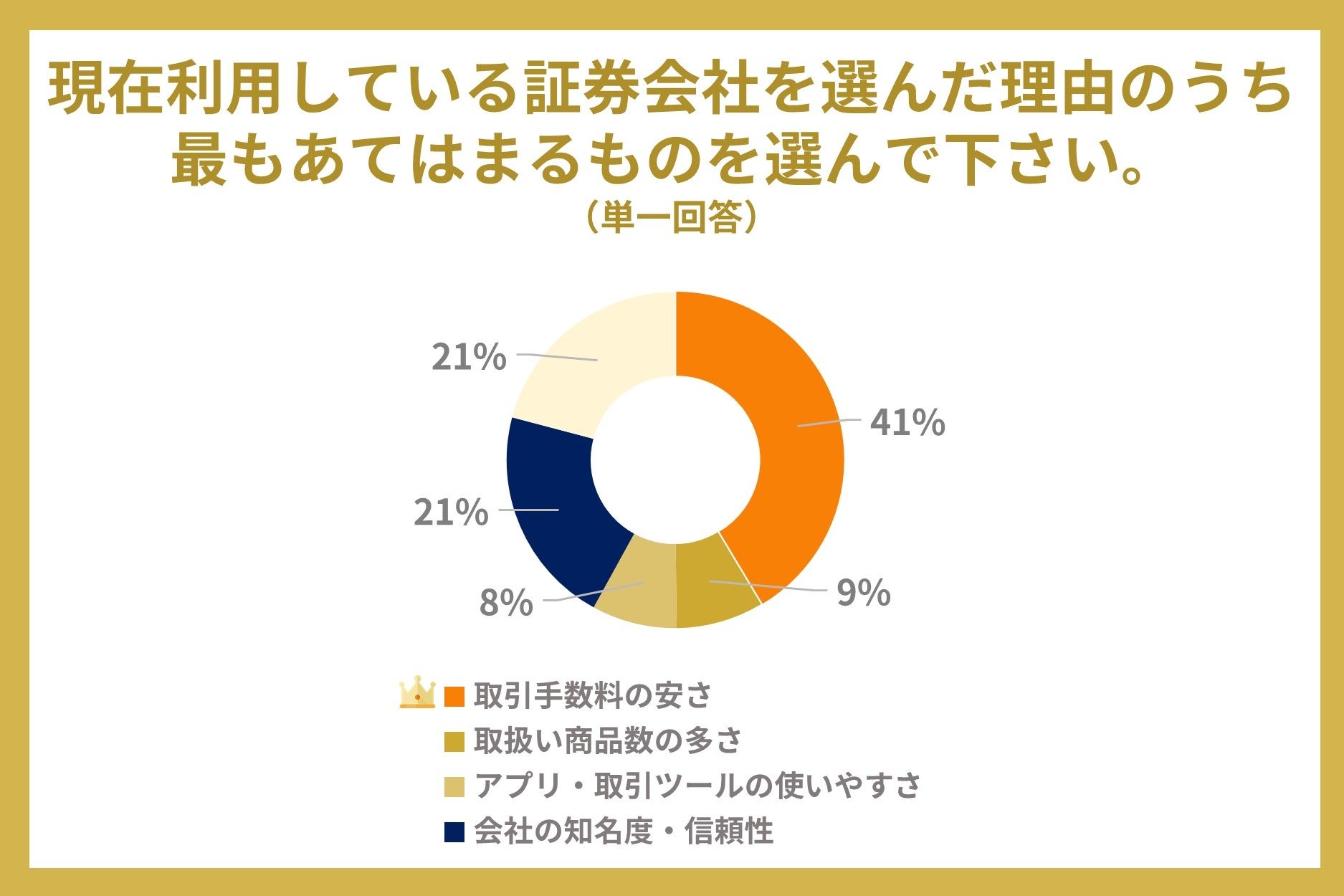 現在利用している証券会社を選んだ理由として、一番多かったのは「取引手数料の安さ」で41.4%の人が取引手数料の安さを重要視していることがわかります。また、「会社の知名度・信頼性」と回答した人は21.1%でした。