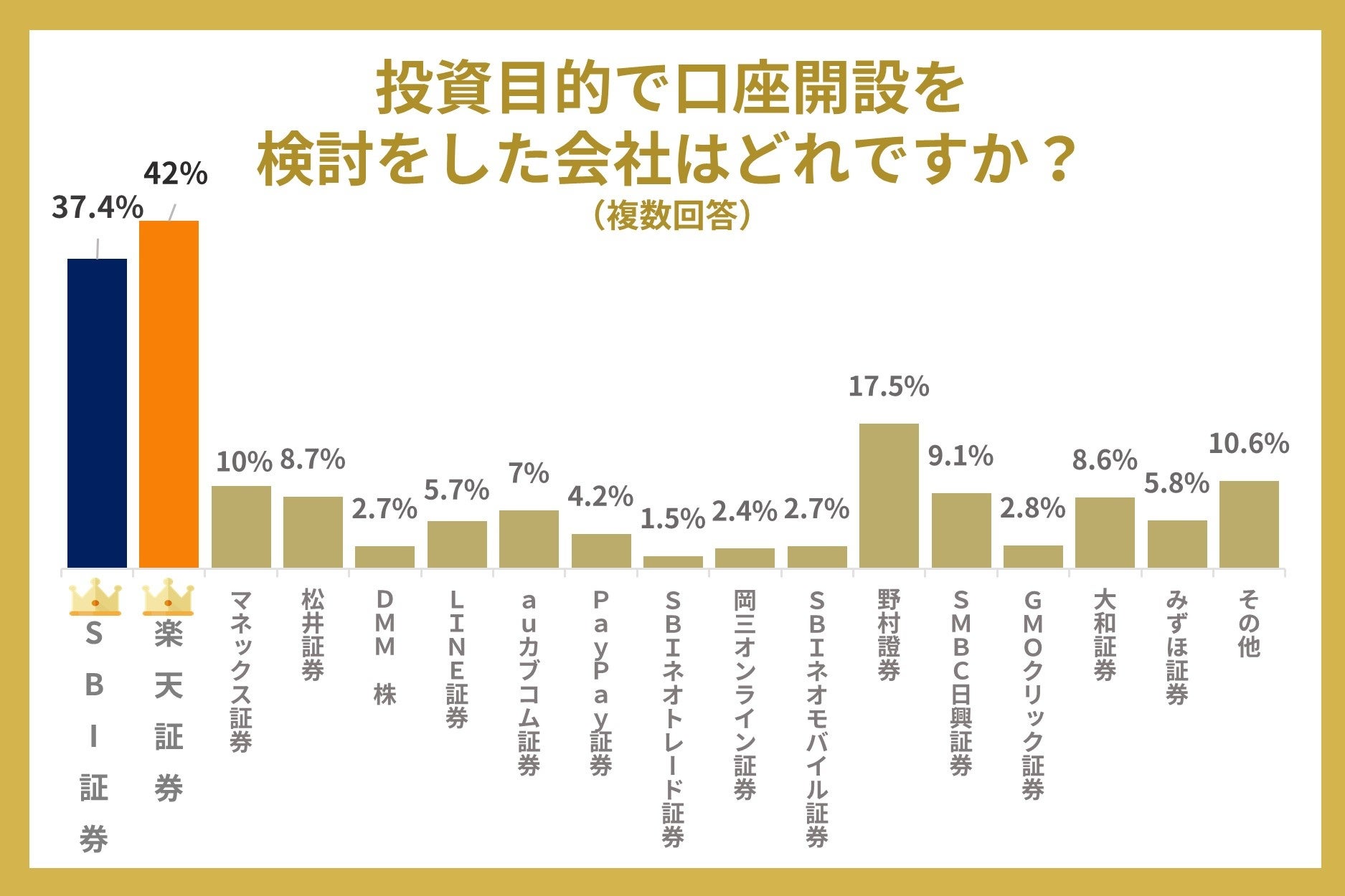 一番多く口座開設されたのは楽天証券(42.0%)で、二番目に多かったのがSBI証券(37.4%)という結果になりました。