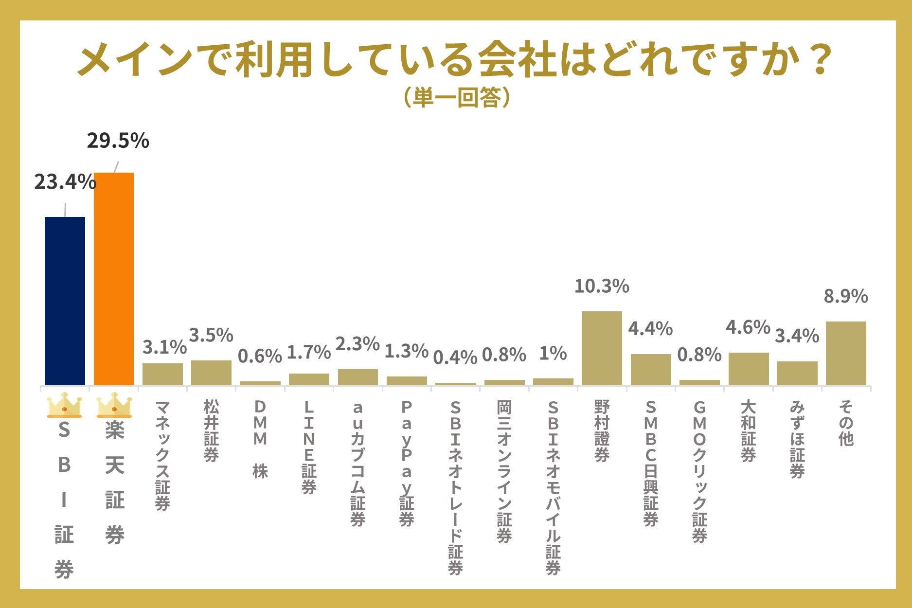 メインで利用されている証券会社でも、一番目は楽天証券(29.5%)で、二番目はSBI証券(23.4%)という結果になりました。