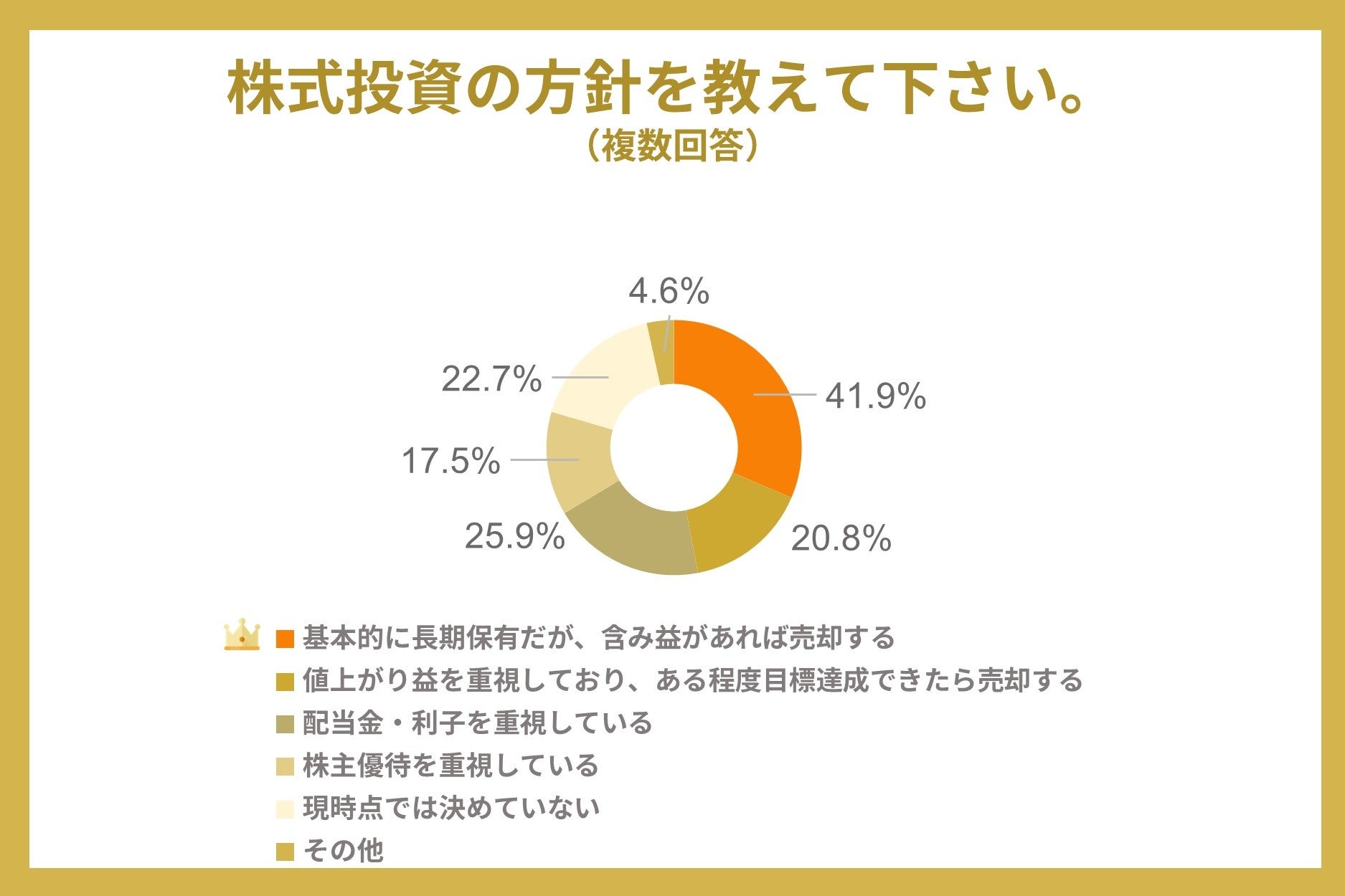 株式投資の方針では、「基本的に長期保有だが、含み益があれば売却する」と回答した人が41.9%と多くを占め、「配当金・利子を重視している」と回答した人が25.9%でした。