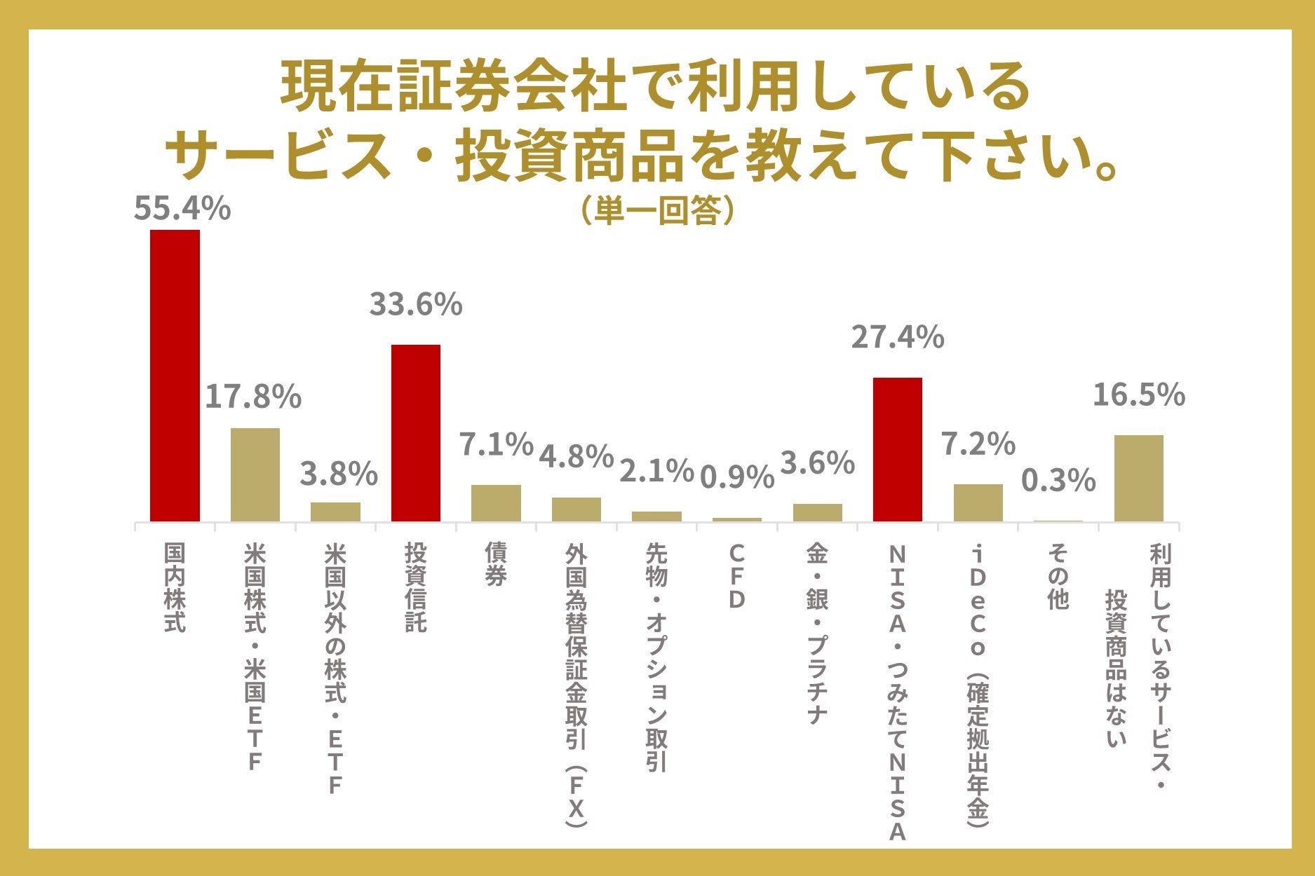 現在利用しているサービス、投資商品で一番多かったのは「国内株式」で55.4%でした。また、二番目に多かったのは「投資信託」で33.6%でした。
