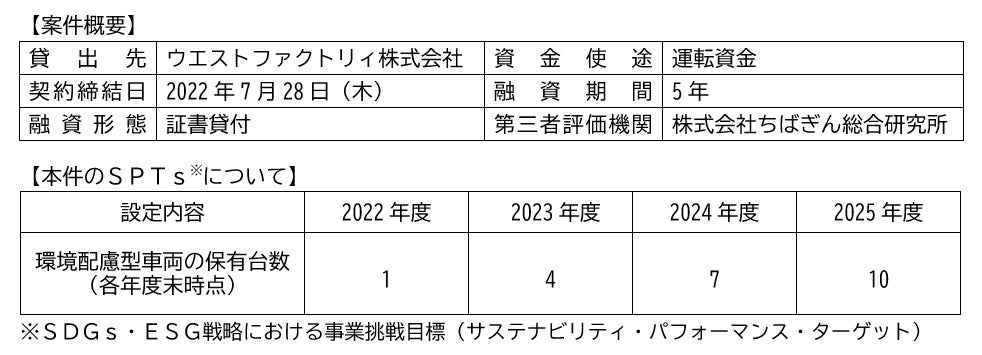 千葉銀行(頭取 米本 努)は、2022年7月28日(木)、ウエストファクトリィ株式会社(代表取締役 山本 そのみ、本社:東京都中央区)に対して、「ちばぎんSDGsリーダーズローン(サステナビリティ・リンク・ローン型)」を取り組みましたのでお知らせします。