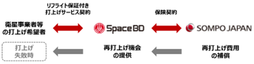 本サービスでは、打上げ希望者が「リフライト保証制度」を利用して、打上げ失敗時に再打上げ機会の提供を受けることができます。打上げ希望者はSpace BDが提供する衛星打上げサービスの有償のオプショナルプランとしてリフライト保証を選択することが可能です。この再打上げに係る費用は損保ジャパンの引受により保険化します。