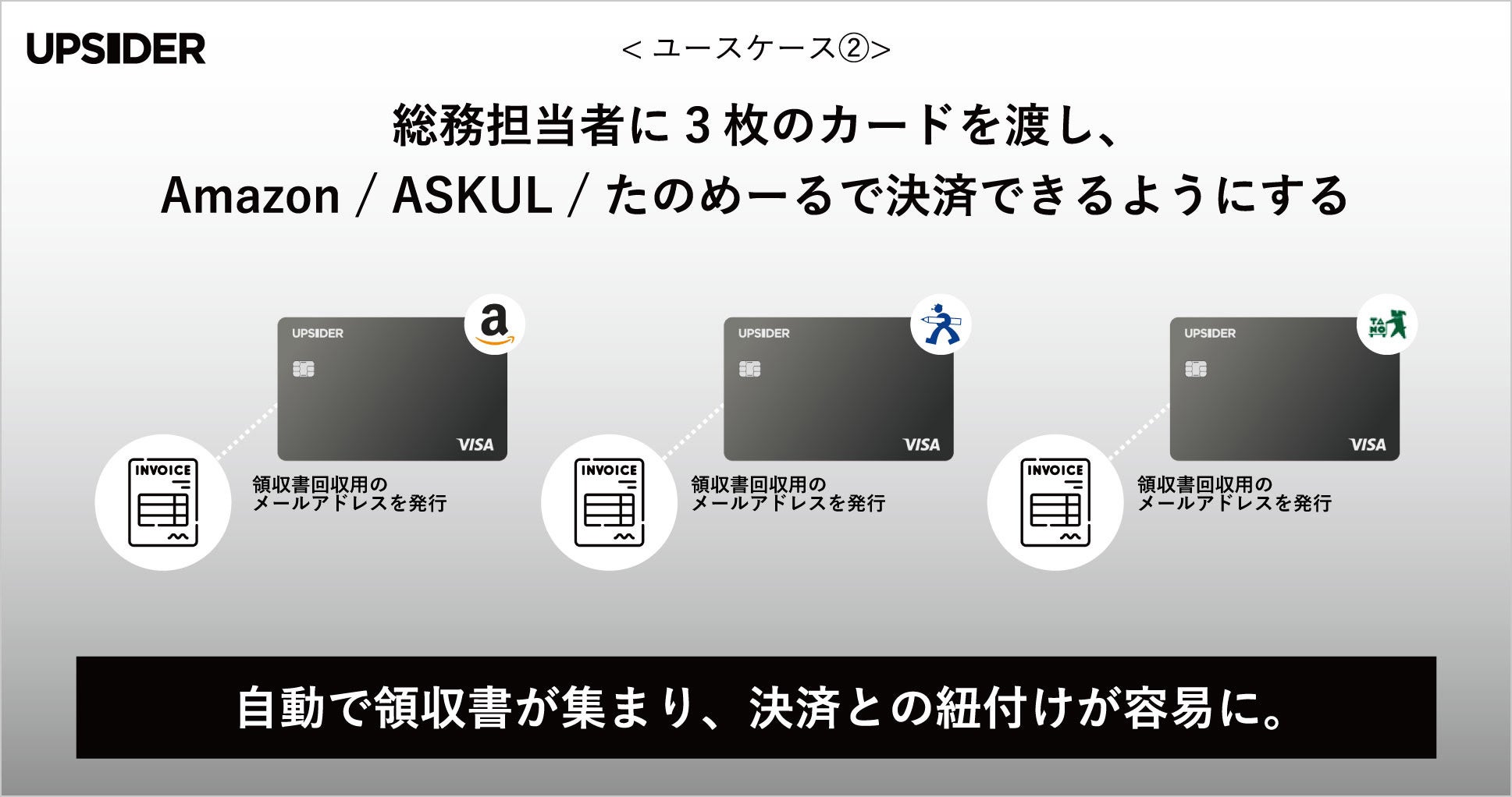 ・総務担当者に、3枚のカードを渡し、それぞれ Amazon / ASKUL / たのめーる で決済できるようにする。領収書回収のメールアドレスをそれぞれ発行し、それぞれのサービスの領収書送付先として指定することで、UPSIDER上に自動で領収書が集まり、回収の手間がなくなる。さらに決済への紐付けも出来るので、決済と領収書の付け合せもラクに。