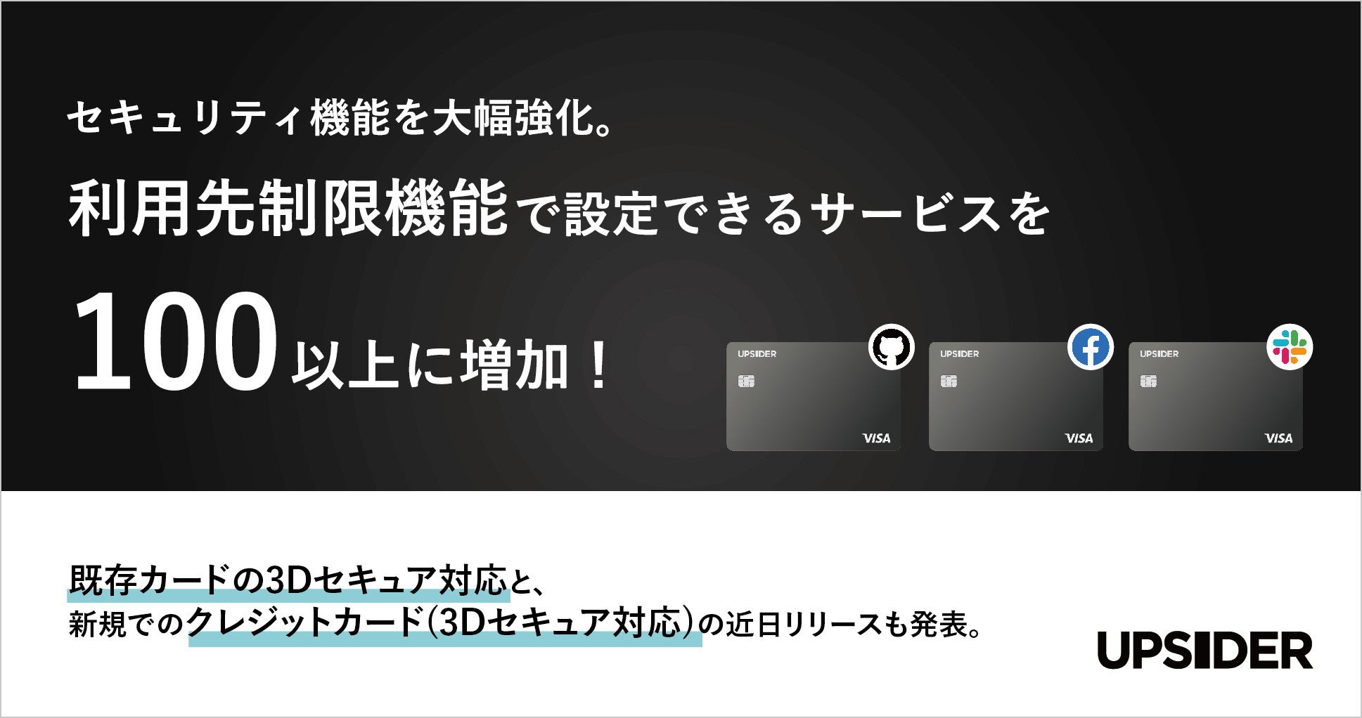 法人カード「UPSIDER」を提供する株式会社UPSIDER(代表取締役:宮城徹、本社:東京都港区、以下 当社)は、カードの利用先制限機能で設定できるサービスを、従来の10以下から100以上に大幅増加しました。