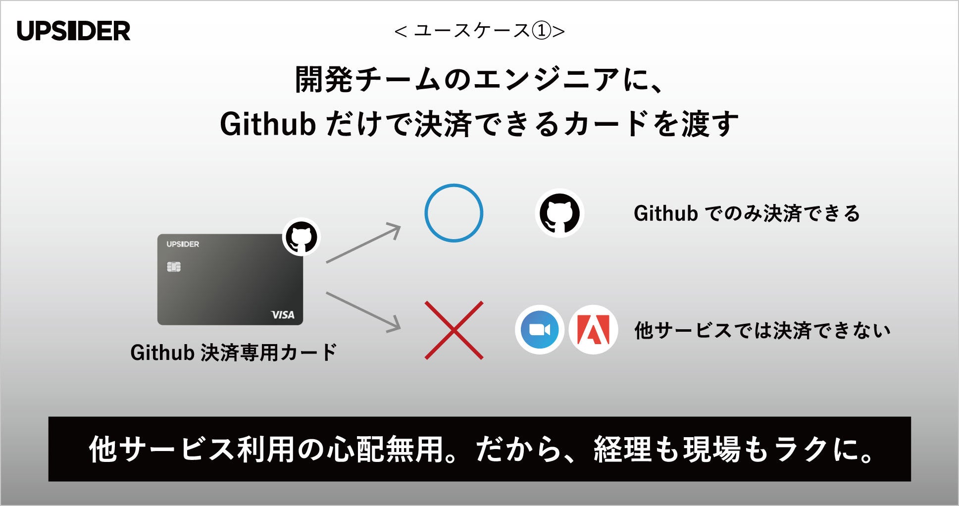・開発チームのエンジニアに、Githubだけで決済できるカードを渡すことで、現場のサービス利用がスムーズになるだけでなく、他のサービスで利用してしまう心配がなくなる。