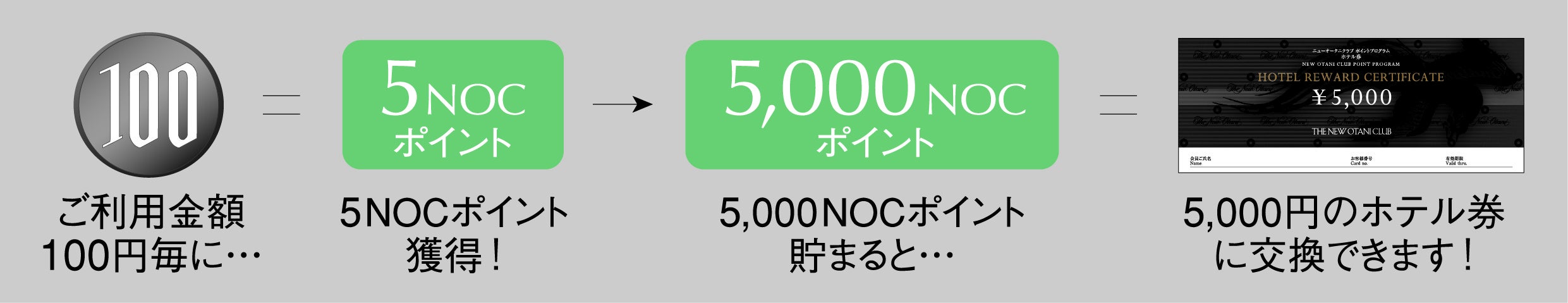 「ニューオータニクラブポイントプログラム」とは、ホテルのご宿泊およびレストラン・バーをご利用の際、ご利用金額100円ごとに5ポイントを付与。5,000ポイント到達ごとに専用のホテル券に換券いたします。
