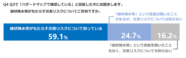 2022年6月より気象庁は、線状降水帯発生の可能性を事前に示す「予測情報」の提供を始めました。お住まいの地域の災害リスク等をハザードマップで確認していると答えた方のうち、「線状降水帯がもたらす災害リスクについて知っている」と答えた方は59.1%、「線状降水帯という言葉は聞いたことがあるが、災害リスクについては知らない」と答えた方が24.7%、「線状降水帯という言葉を聞いたこともなく、災害リスクについても知らない」と答えた方が16.2%となりました。