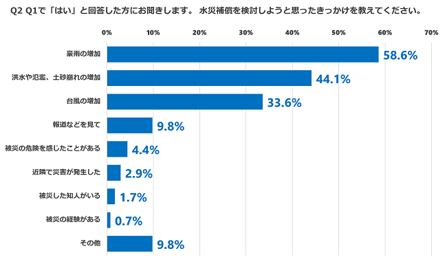 水災補償を検討していると答えた方のうち、検討のきっかけ(複数回答可)は「豪雨の増加」が58.6%と最も多く、次いで「洪水や氾濫、土砂崩れの増加」が44.1%、「台風の増加」が33.6%と続きました。