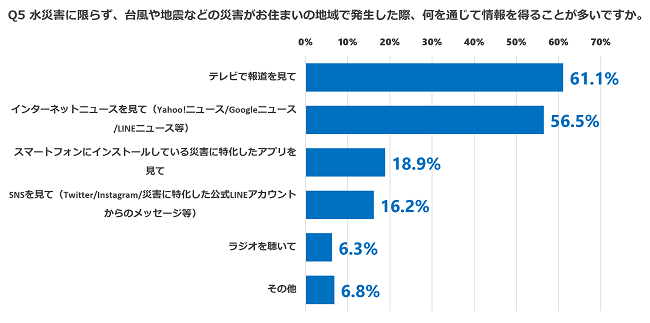 水災害に限らず、お住まいの地域で台風や地震などの災害が発生した際、情報を得る手段(複数回答可)は「テレビで報道を見て」が61.1%と最も多く、次いで「インターネットニュースを見て」が56.5%、「スマートフォンにインストールしている災害に特化したアプリを見て」が18.9%と続きました。