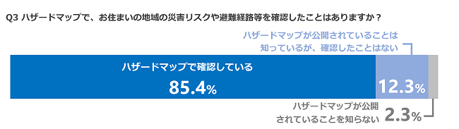 国土交通省や各自治体では、自然災害が発生した場合の被害を予測し、被害範囲や避難経路などを地図にまとめたハザードマップを公開しています。お住まいの地域の災害リスクや避難経路等をハザードマップで「確認している」と答えた方は85.4%、「公開されていることは知っているが、確認したことはない」と答えた方が12.3%、「公開されていることを知らない」と答えた方が2.3%となりました。