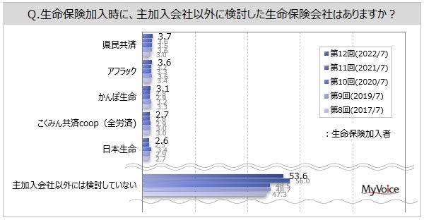 | <今 回>(2022/7)https://myel.myvoice.jp/products/detail.php?product_id=28809 ※上記設問の他に「生命保険会社の認知」「1か月あたりの生命保険料」「加入したい生命保険会社」も聞いています。 <第11回>(2021/7)https://myel.myvoice.jp/products/detail.php?product_id=27606 <第10回>(2020/7)https://myel.myvoice.jp/products/detail.php?product_id=26405 |