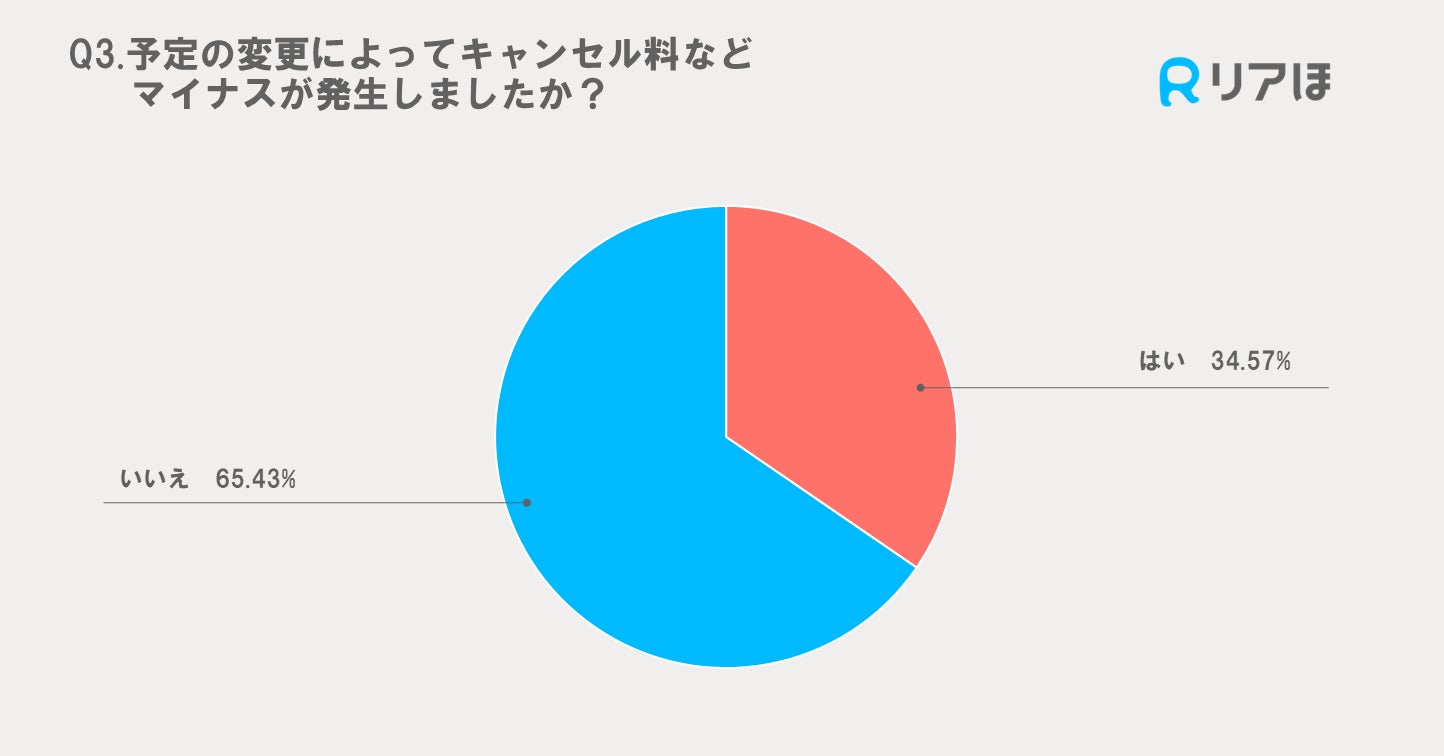 旅行や帰省の予定変更によるキャンセル料などについては34.57%の方が、キャンセル料などがかかりマイナスが発生したと回答しました。