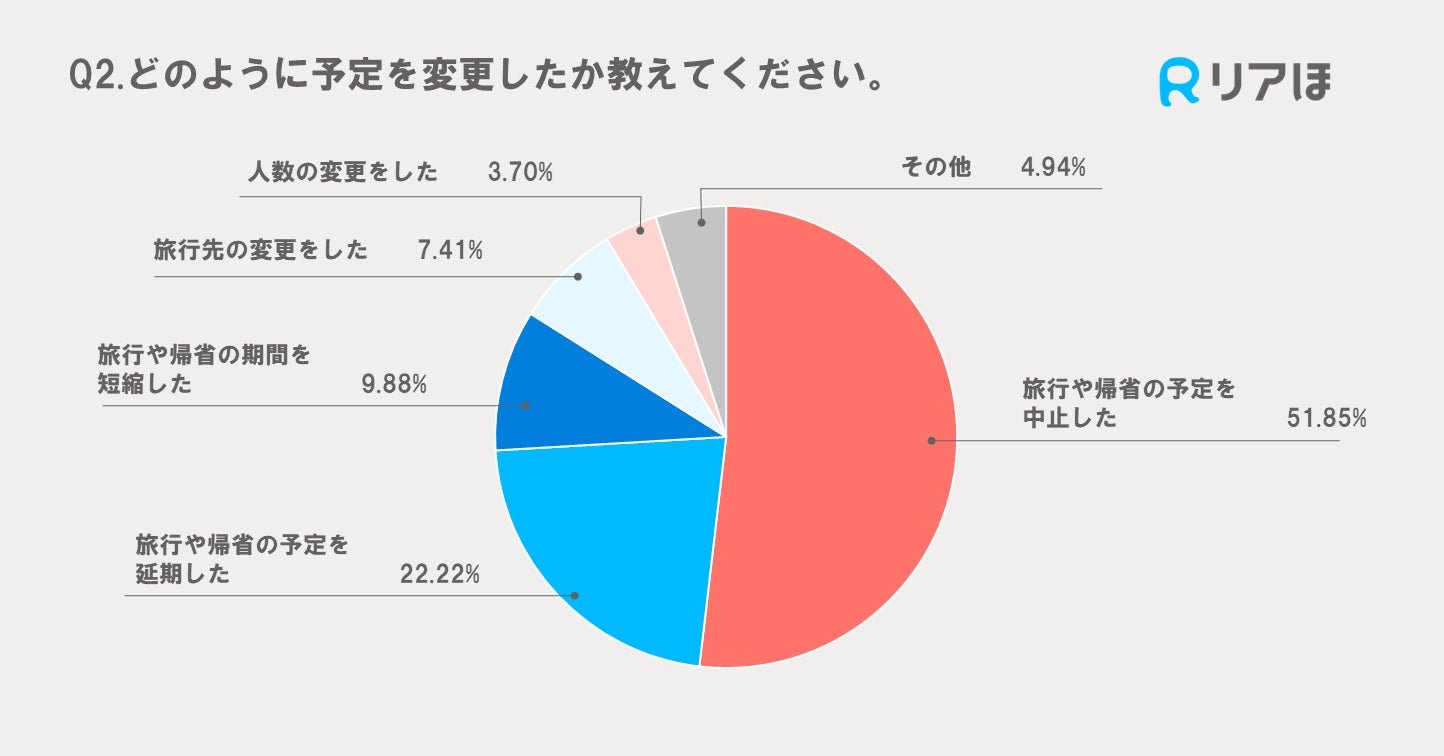 Q1で「はい」と回答した方に、どのように予定を変更したのか質問したところ、「旅行や帰省の予定を中止した」が最も多く51.85%、次いで「旅行や帰省の予定を延期した」が22.22%となりました。