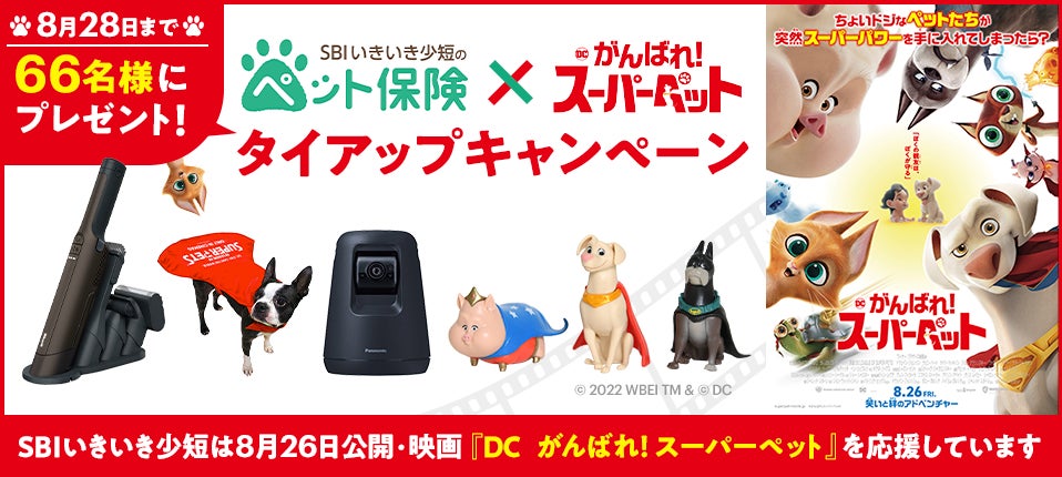 SBIいきいき少額短期保険株式会社(本社:東京都港区、代表取締役社長:新村 光由、以下「当社」)は、8月26日(金)全国ロードショー 映画『DC がんばれ!スーパーペット』を応援するキャンペーンとして、総勢66名様に豪華賞品が当たるプレゼントキャンペーンを実施します。