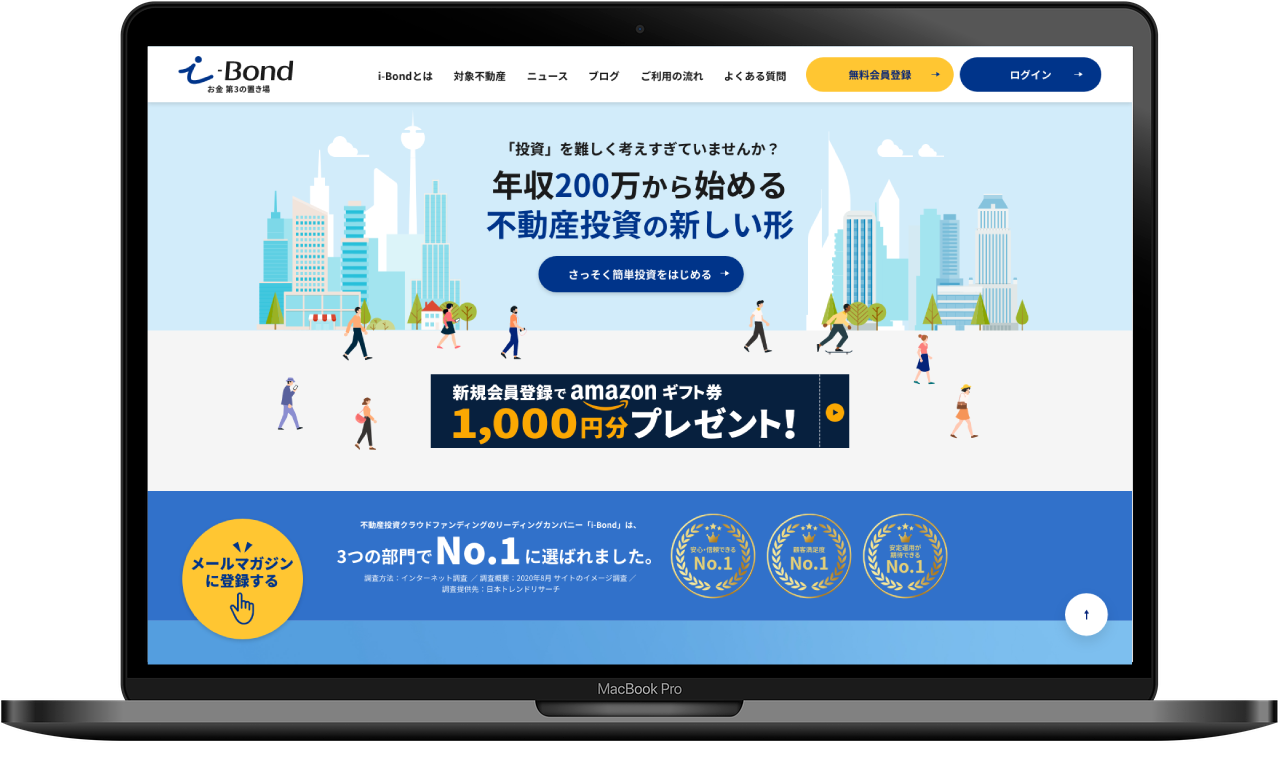 i-Bondは不動産を所有することなく、1万円で家賃収入が安定的に得られる新しいサービスです。いつ入れても、いつ出しても自由。”不動産”という安定資産から家賃収入を得る、新しい直接投資です。預貯金への不満と投資への不安を取り除く「お金 第3の置き場」です。