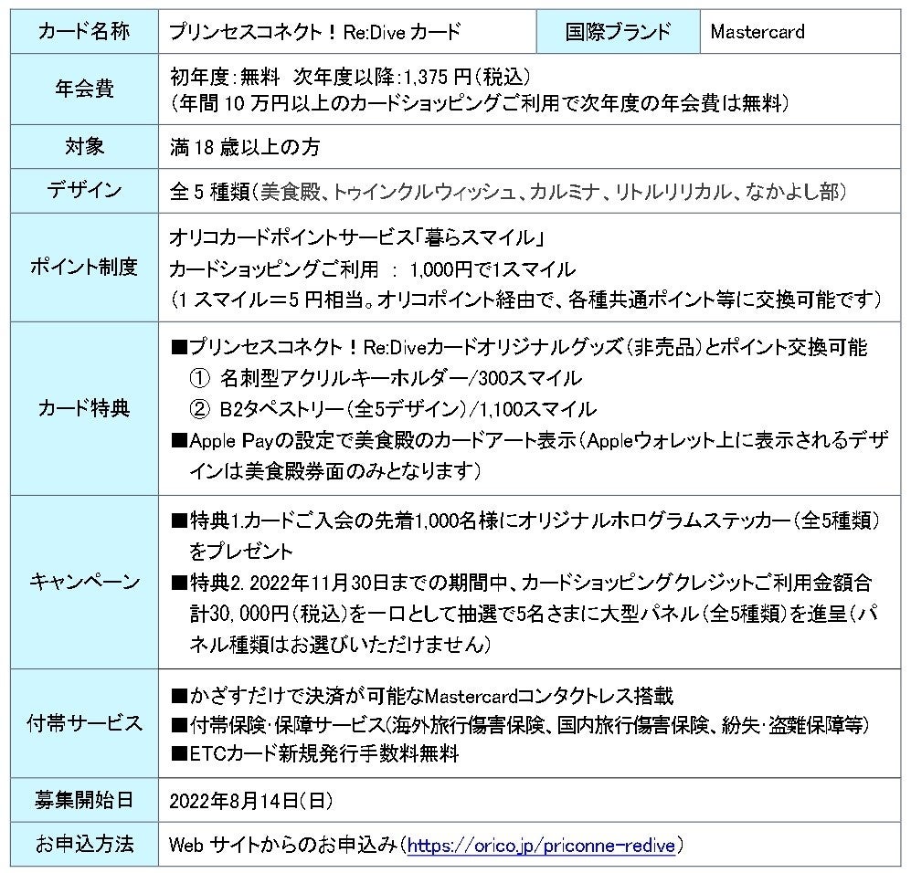株式会社オリエントコーポレーション(東京都千代田区、代表取締役社長:飯盛 徹夫、以下「オリコ」)は、株式会社Cygames(東京都渋谷区、代表取締役:渡邊 耕一)と提携し、「プリンセスコネクト!Re:Dive カード」の発行を8月14日より開始いたしました。