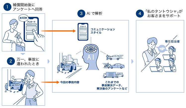 お客さまには、約40秒のアンケートにお答えいただくだけ。アンケートの結果から、ソーシャルスタイル理論(※2)に基づいてコミュニケーションスタイルを推定。そして万一事故にあわれた際には、AI(※3)を活用し、コミュニケーションスタイルや事故の内容からお客さまにぴったりの担当者を選任します。