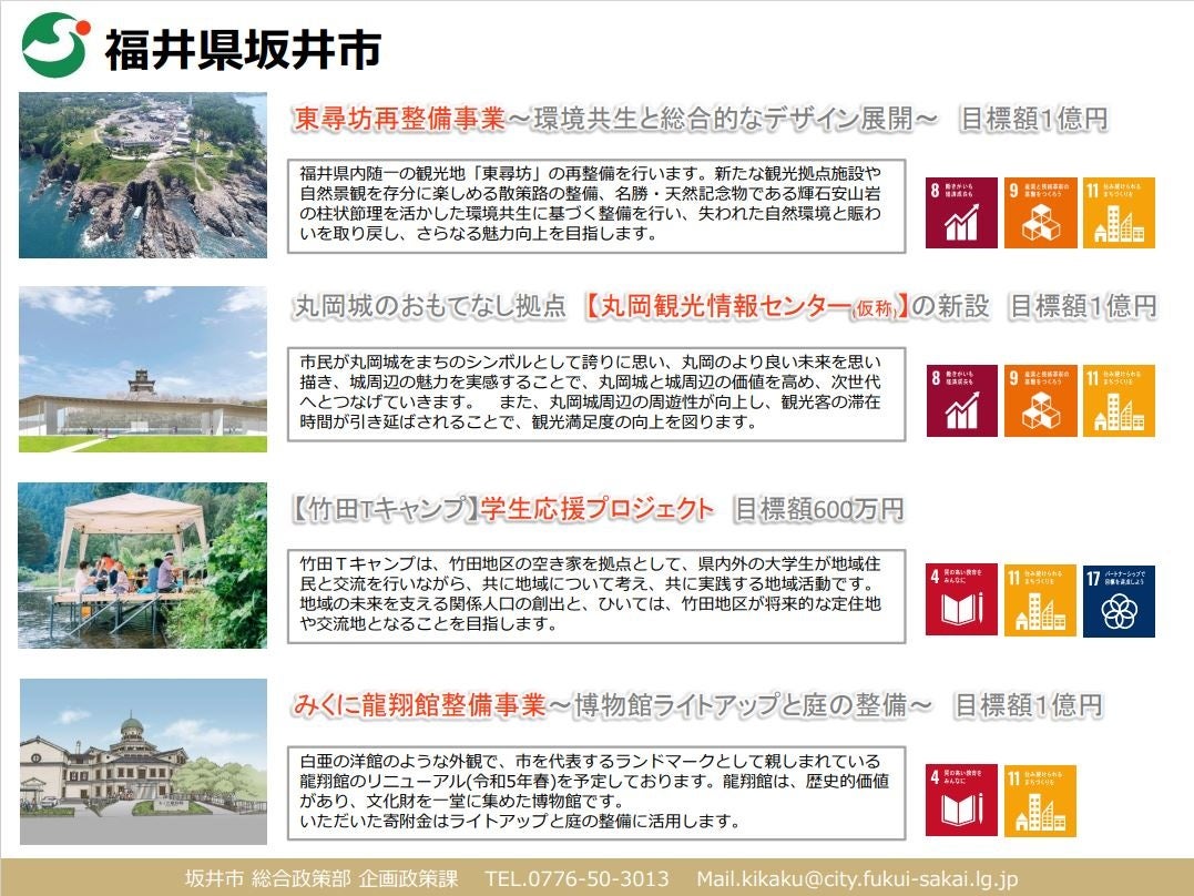 福井県坂井市は「坂井市まち・ひと・しごと創生推進計画」のなかで、特に4つの重点プロジェクトを定めています。1つ目は、東尋坊再整備事業(環境共生と総合的なデザイン展開)、2つ目は、丸岡城のおもてなし拠点「丸岡観光情報センター(仮称)」の新設、3つ目は、「竹田Tキャンプ」学生応援プロジェクト、4つ目は、みくに龍翔館整備事業(博物館ライトアップと庭の整備)です。福邦銀行は、これら4つの重点プロジェクトの実施・実現に向けて、全国の企業から企業版ふるさと納税の寄附見込企業を坂井市へ紹介していきます。