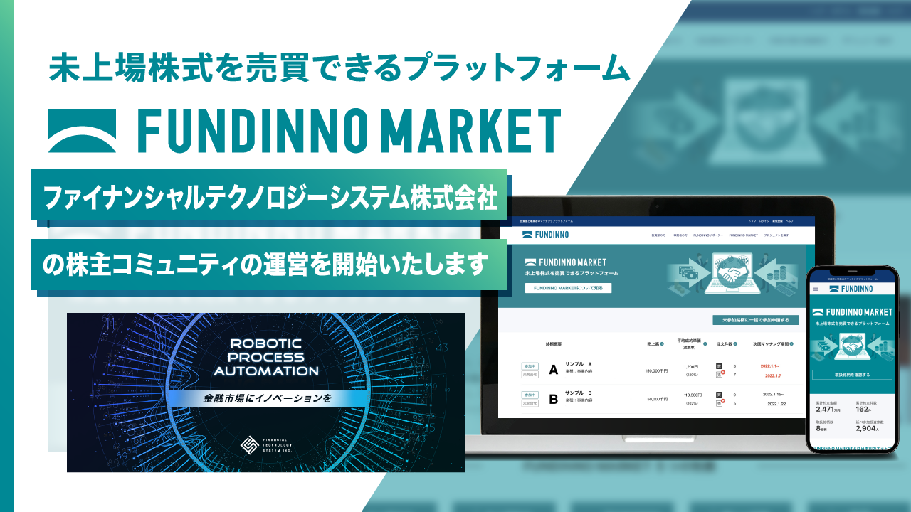 株式会社FUNDINNO(本社:東京都品川区、代表:柴原 祐喜/大浦 学、以下「FUNDINNO」)は、2022年8月19日(金)、FUNDINNO MARKET*においてファイナンシャルテクノロジーシステム株式会社(代表取締役:垂井 茂雄 以下「FTS」)の株主コミュニティを組成し、運営を開始いたしました。