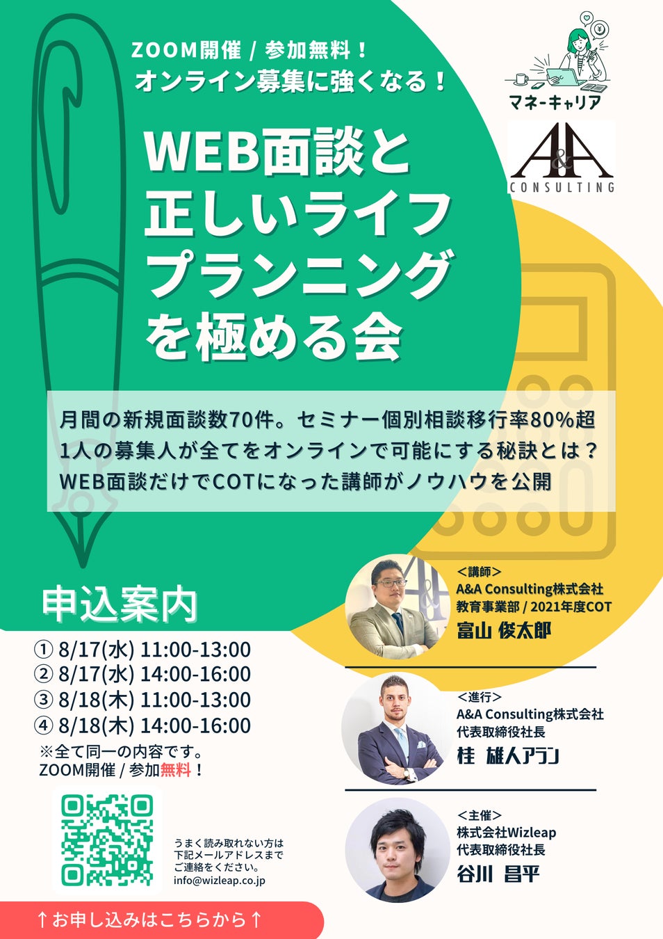 お金の相談プラットフォーム「マネーキャリア」を運営する株式会社Wizleap(東京都渋谷区、代表取締役 谷川昌平)は、2022年8月17日(水)、8月18日(木)にオンライン配信の業界最大級の金融セールス向けセミナー「オンライン募集に強くなる!WEB面談と正しいライフプランニングを極める会」を実施しましたことを報告いたします。