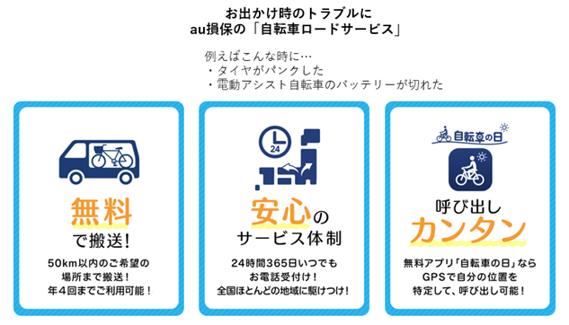 au損害保険株式会社(本社:東京都港区、代表取締役社長:山田隆章、以下、au損保)は、自転車向け保険のご契約者に対し、2013年10月1日より全国でご利用頂ける「自転車ロードサービス」を提供しております。