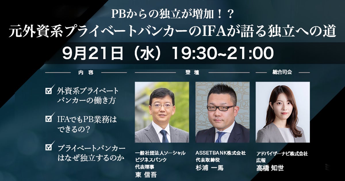 IFAのコンサルティング事業・人材紹介業・富裕層とIFAのマッチング事業を運営するアドバイザーナビ株式会社は(所在地:中央区日本橋、代表取締役:平 行秀、以下当社)は、ウェビナーを開催をいたします。
