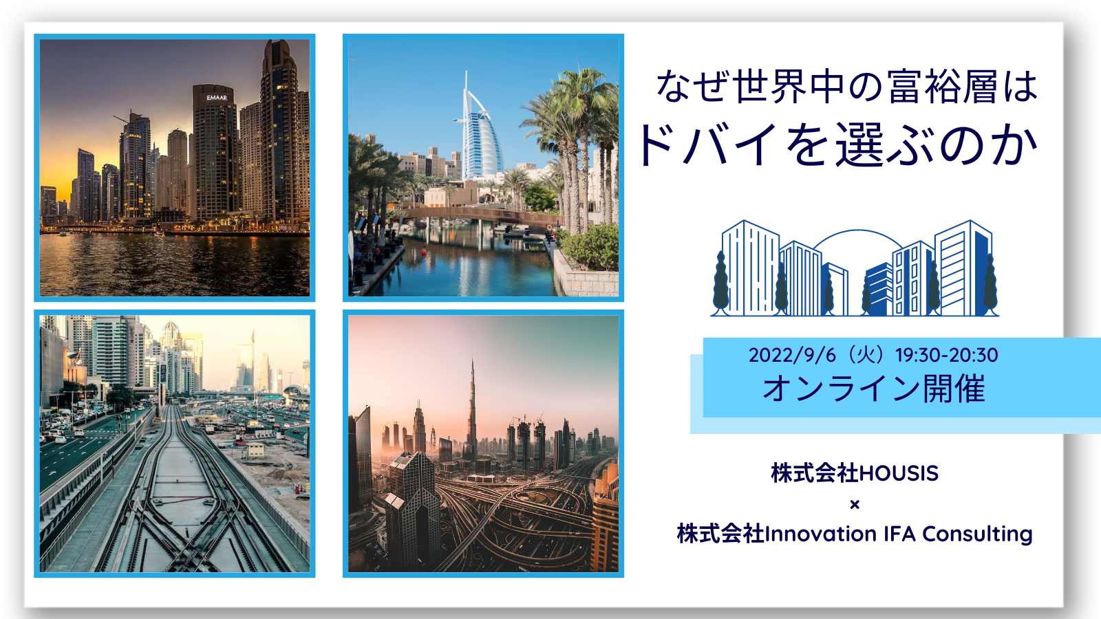 株式会社Innovation IFA Consulting(本社:東京都渋谷区、代表取締役:馬場勝寛、以下「Innovation IFA Consulting」)は、収益用不動産の販売及び仲介を行う株式会社HOUSIS(本社:東京都渋谷区、代表取締役社長:森勝繁氏、以下「HOUSIS」)と共催で、2022年9月6日(火)19時30分よりドバイの不動産市況と投資方法について話すセミナー「なぜ世界中の富裕層はドバイを選ぶのか」を開催することを決定致しました。