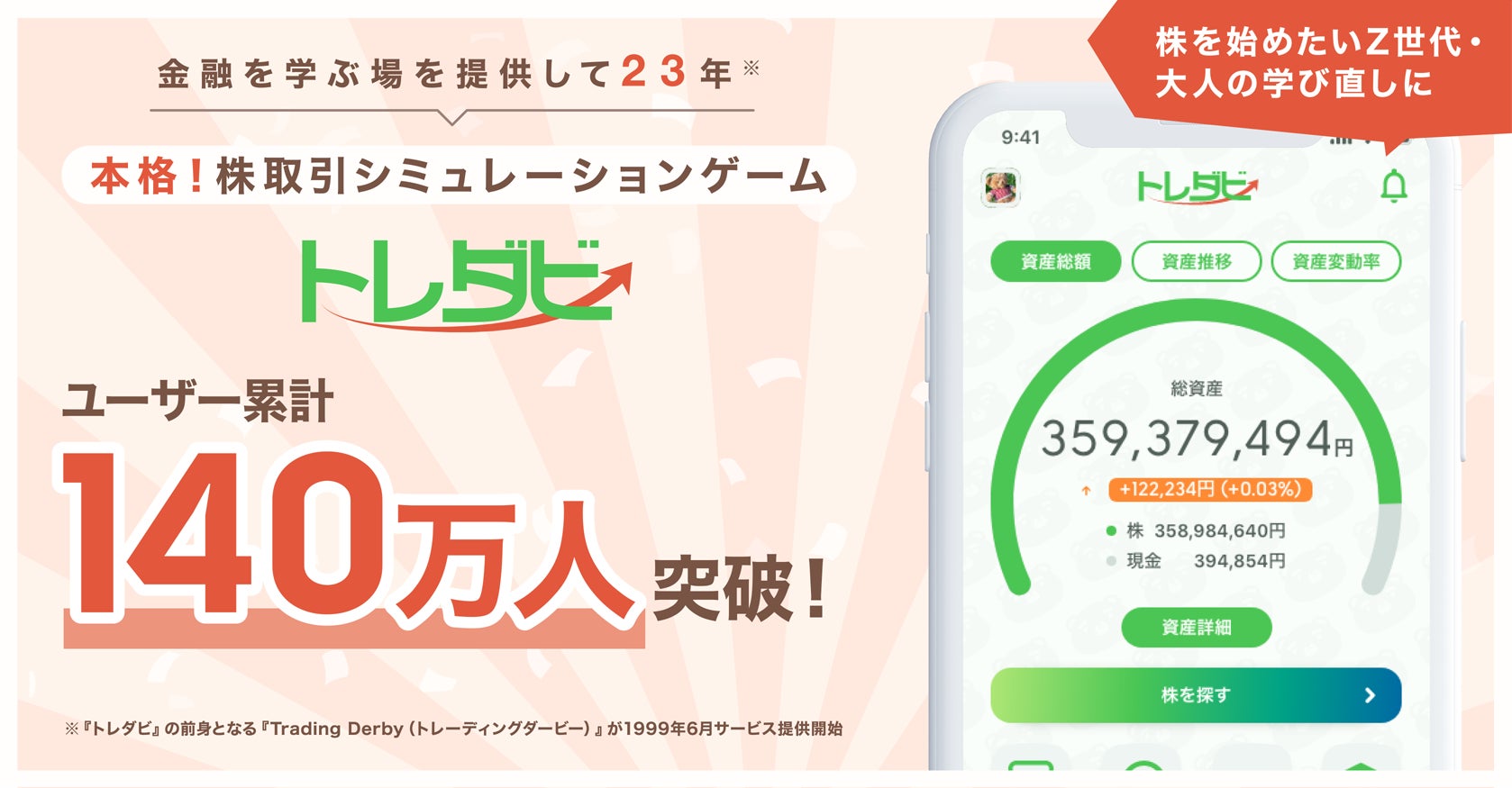 次世代金融インフラの提供を通して組込型金融を実現し、金融がもっと暮らしに寄り添う世の中を創るFinatextグループの株式会社K-ZONE(代表取締役 CEO:木下 あかね、以下当社)は、金融を学ぶ場としてサービス提供開始から23年を迎えた(※)株取引シミュレーションゲーム『トレダビ』の会員数が累計140万人を突破したことをお知らせします。