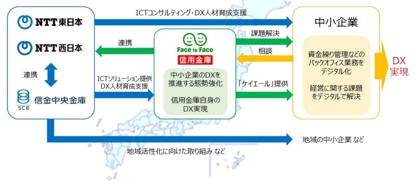 こうした課題を解決すべく、信用金庫業界が有する中小企業との強固なリレーションと、NTT 東日本・NTT 西日本が有するデジタル分野に関する高い知見を結集し、地域経済を担う中小企業1社1社に DX を浸透させるため、この度3社で業務提携することを決定いたしました。