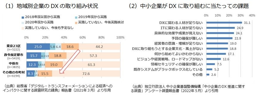 2022 年6月に閣議決定された「デジタル田園都市国家構想基本方針」では、デジタル技術を「地方の社会課題を解決する鍵」とし、官民一体となって地域社会の DX を強力に支援することが掲げられております。一方で、地域経済を支える中小企業の多くは、人材・ノウハウ不足などの課題を抱えており、自社の力のみでDXを実現することは難しくなっています。
