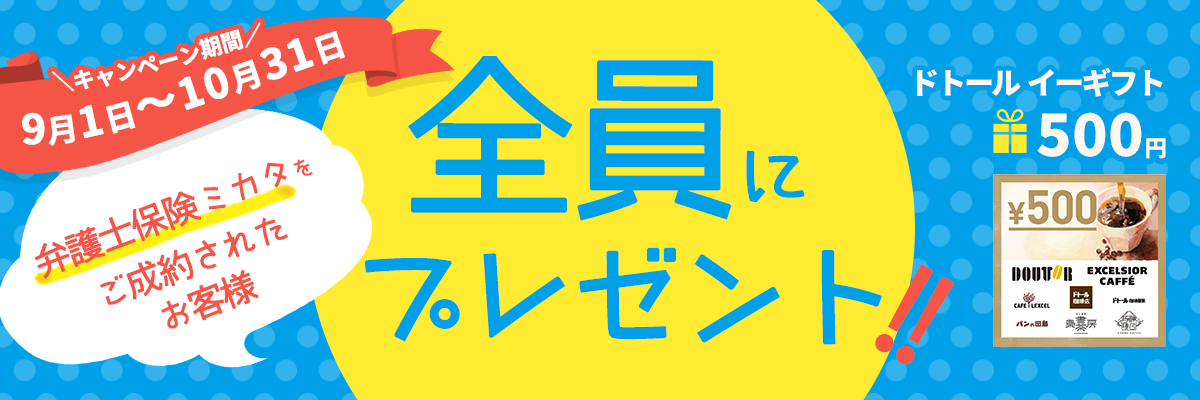 対象期間中に弁護士保険STATION経由で、ミカタ少額短期保険株式会社「弁護士保険ミカタ」の契約申込を完了し、ご契約が成立されたお客様全員に、「ドトールコーヒー ドトール イーギフト500円」をプレゼントします。