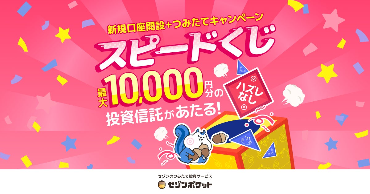 『セゾンポケット』は2019年に生まれた、つみたてNISAを始めとする投資信託などのわかりやすさを追求して開発された、投資が初めての方にぴったりなサービスです。「スピードくじ」では、セゾンポケット証券口座開設時と投資信託あるいは株のつみたて買付完了時の2回、合計最大10,000円分の投資信託が当たります。始めるタイミングがわからなかった方も、セゾンポケット証券口座は開設したもののつみたて設定をせずに放置してしまった方も。この機会にぜひ、つみたて投資を開始してみてはいかがでしょうか。『セゾンポケット』では、今後も投資を始める際の「何から始めたらいいか、わからない…」を解消するお手伝いをしてまいります。