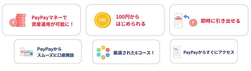 本サービスの提供開始を記念して、2022年9月1日(木)より「PayPay資産運用はじめようキャンペーン」を開始いたします。キャンペーン期間中、PayPay資産運用からPayPay証券口座の開設をした方全員に、もれなく100円相当のコース購入代金をプレゼントいたします。100円からの運用が可能なため、自己負担額0円で資産運用を開始いただけます。「何から始めたらいいか分からない」「資金に余裕がないけど少額からなら始めてみたい」など、いままで資産運用をされたことがないという方も、この機会にぜひご利用ください。