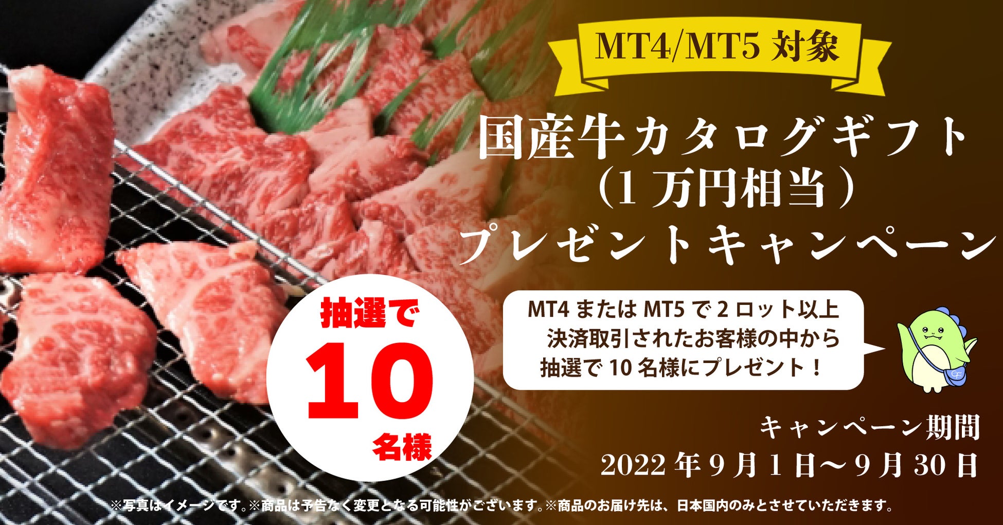 期間中にMT4またはMT5で2ロット以上決済取引したお客様の中から抽選で10名様に「国産牛カタログギフト」をプレゼントいたします。