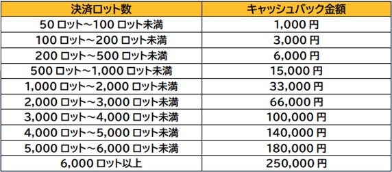 ※6,000ロット以上決済取引された場合でもキャッシュバック金額は25万円です。