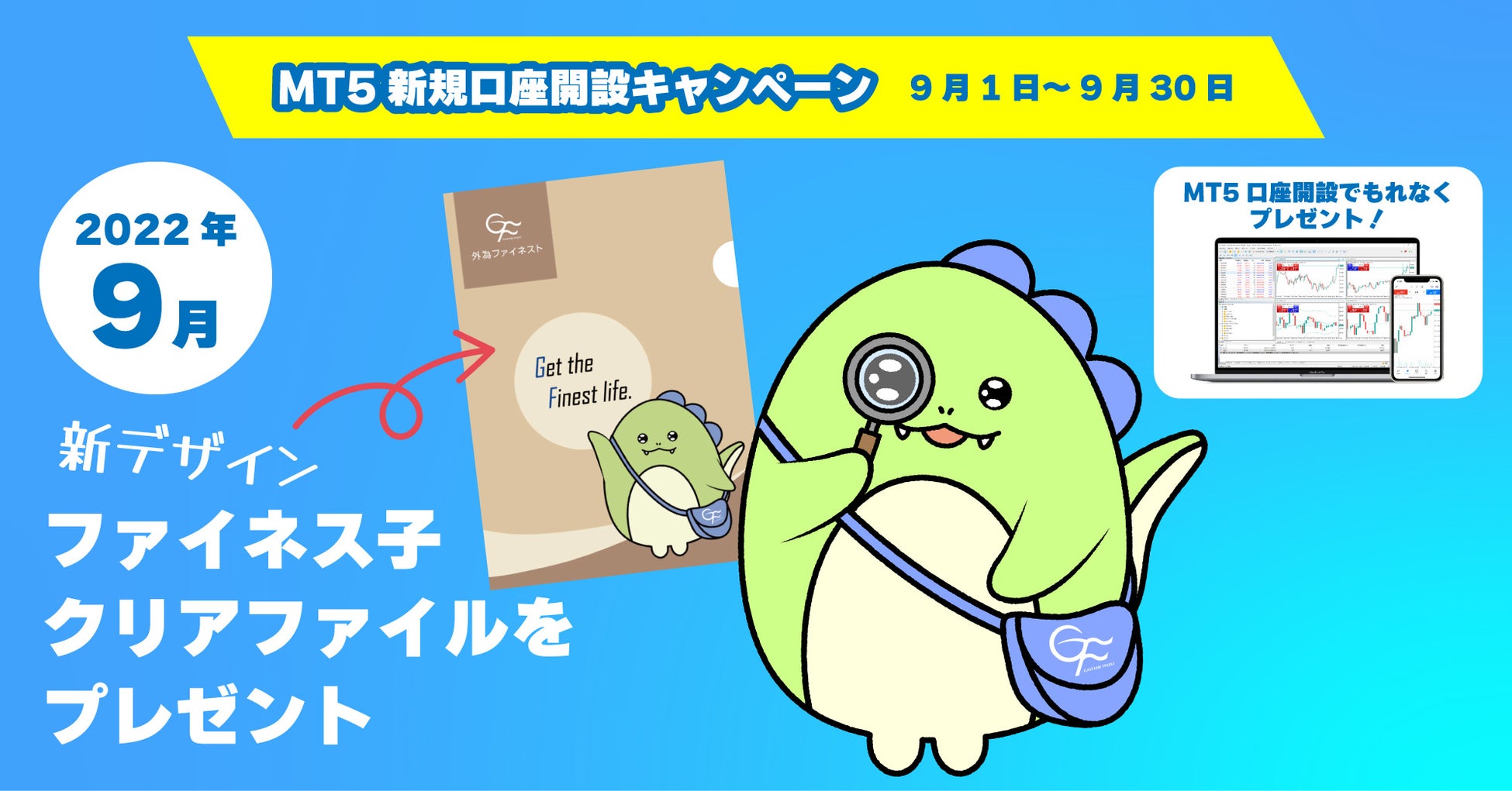 期間中、MT5口座を開設いただいたお客様にもれなく、特製「ファイネス子」クリアファイル(2022年秋の新デザイン)をプレゼントいたします。