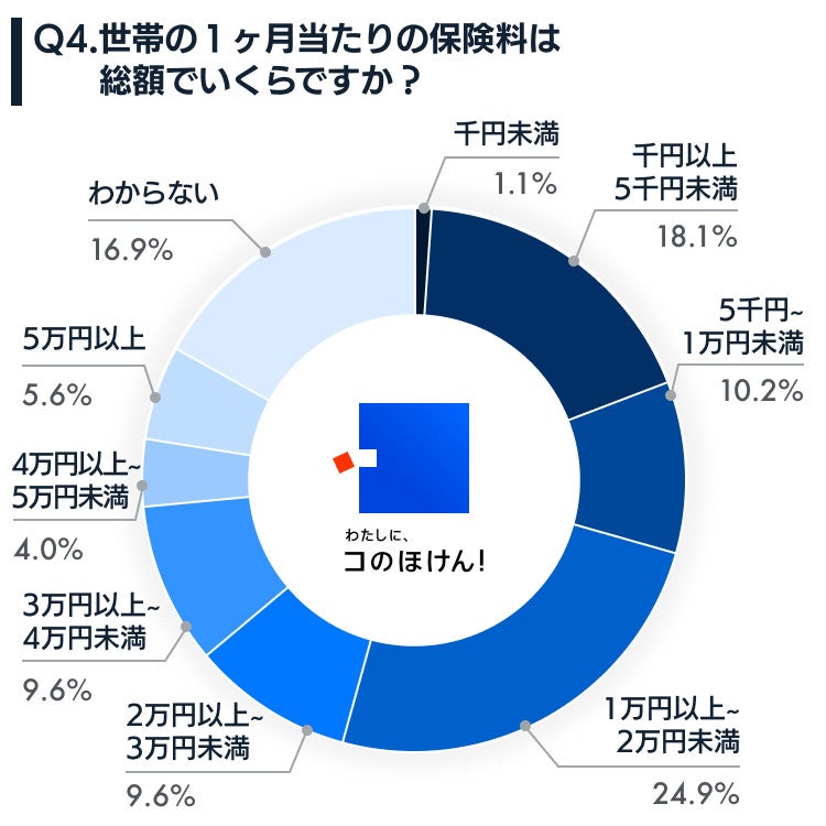 Q1で保険に加入していると回答した177人に、1ヶ月当たりの保険料の総額を質問したところ、『1万円以上2万円未満』24.9%のが最多の回答となりました。